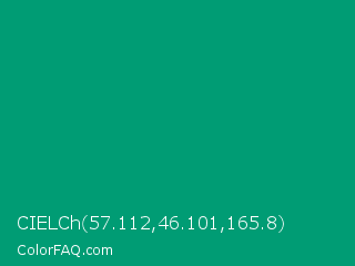 CIELCh 57.112,46.101,165.8 Color is a normal cyan color and the nearest color is Paolo Veronese Green #009b7d. Hex code #009c74 and RGB value is rgb(0,156,116). In RGB color space, this color is composed of 0% red, 61% green, 45% blue, In CMYK color space, this color is composed of 100% cyan, 0% magenta, 26% yellow , 39% black , In HSL color space, this color has a hue angle of 165° , 100% saturation and 31% lightness.