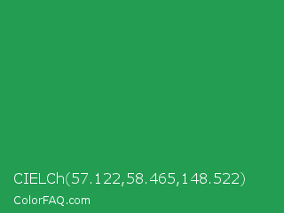CIELCh 57.122,58.465,148.522 Color is a normal green color and the nearest color is Eucalyptus #278a5b. Hex code #229d51 and RGB value is rgb(34,157,81). In RGB color space, this color is composed of 13% red, 62% green, 32% blue, In CMYK color space, this color is composed of 78% cyan, 0% magenta, 48% yellow , 38% black , In HSL color space, this color has a hue angle of 143° , 64% saturation and 37% lightness.