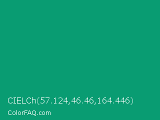 CIELCh 57.124,46.46,164.446 Color is a normal green color and the nearest color is Green NCS #009f6b. Hex code #099c72 and RGB value is rgb(9,156,114). In RGB color space, this color is composed of 4% red, 61% green, 45% blue, In CMYK color space, this color is composed of 94% cyan, 0% magenta, 27% yellow , 39% black , In HSL color space, this color has a hue angle of 163° , 89% saturation and 32% lightness.
