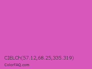 CIELCh 57.12,68.25,335.319 Color is a normal magenta color and the nearest color is Fuchsia Pink #c154c1. Hex code #d857bc and RGB value is rgb(216,87,188). In RGB color space, this color is composed of 85% red, 34% green, 74% blue, In CMYK color space, this color is composed of 0% cyan, 60% magenta, 13% yellow , 15% black , In HSL color space, this color has a hue angle of 313° , 62% saturation and 59% lightness.
