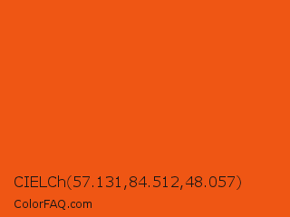 CIELCh 57.131,84.512,48.057 Color is a normal orange color and the nearest color is Orioles Orange #fb4f14. Hex code #ef5614 and RGB value is rgb(239,86,20). In RGB color space, this color is composed of 94% red, 34% green, 8% blue, In CMYK color space, this color is composed of 0% cyan, 64% magenta, 92% yellow , 6% black , In HSL color space, this color has a hue angle of 18° , 87% saturation and 51% lightness.