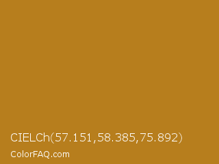 CIELCh 57.151,58.385,75.892 Color is a normal orange color and the nearest color is Mandalay #ad781b. Hex code #b77e1d and RGB value is rgb(183,126,29). In RGB color space, this color is composed of 72% red, 49% green, 11% blue, In CMYK color space, this color is composed of 0% cyan, 31% magenta, 84% yellow , 28% black , In HSL color space, this color has a hue angle of 38° , 73% saturation and 42% lightness.