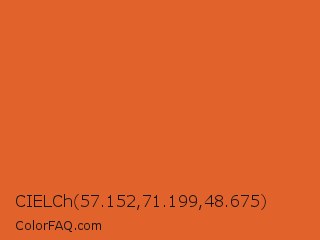 CIELCh 57.152,71.199,48.675 Color is a normal orange color and the nearest color is Vivid Red Tangelo #df6124. Hex code #e2622b and RGB value is rgb(226,98,43). In RGB color space, this color is composed of 89% red, 38% green, 17% blue, In CMYK color space, this color is composed of 0% cyan, 57% magenta, 81% yellow , 11% black , In HSL color space, this color has a hue angle of 18° , 76% saturation and 53% lightness.