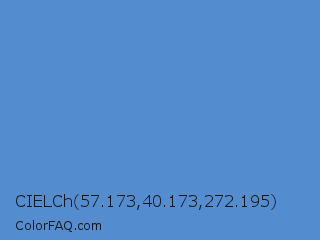 CIELCh 57.173,40.173,272.195 Color is a normal blue color and the nearest color is Havelock Blue #5590d9. Hex code #538ccf and RGB value is rgb(83,140,207). In RGB color space, this color is composed of 33% red, 55% green, 81% blue, In CMYK color space, this color is composed of 60% cyan, 32% magenta, 0% yellow , 19% black , In HSL color space, this color has a hue angle of 212° , 56% saturation and 57% lightness.
