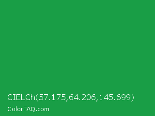 CIELCh 57.175,64.206,145.699 Color is a normal green color and the nearest color is Green Pigment #00a550. Hex code #199e46 and RGB value is rgb(25,158,70). In RGB color space, this color is composed of 10% red, 62% green, 27% blue, In CMYK color space, this color is composed of 84% cyan, 0% magenta, 56% yellow , 38% black , In HSL color space, this color has a hue angle of 140° , 73% saturation and 36% lightness.