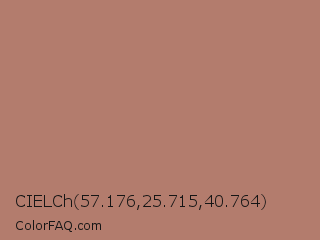 CIELCh 57.176,25.715,40.764 Color is a normal red color and the nearest color is Copper Penny #ad6f69. Hex code #b37c6d and RGB value is rgb(179,124,109). In RGB color space, this color is composed of 70% red, 49% green, 43% blue, In CMYK color space, this color is composed of 0% cyan, 31% magenta, 39% yellow , 30% black , In HSL color space, this color has a hue angle of 13° , 32% saturation and 56% lightness.