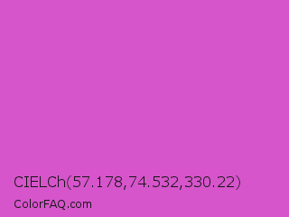 CIELCh 57.178,74.532,330.22 Color is a normal magenta color and the nearest color is Fuchsia Pink #c154c1. Hex code #d655cb and RGB value is rgb(214,85,203). In RGB color space, this color is composed of 84% red, 33% green, 80% blue, In CMYK color space, this color is composed of 0% cyan, 60% magenta, 5% yellow , 16% black , In HSL color space, this color has a hue angle of 305° , 61% saturation and 59% lightness.