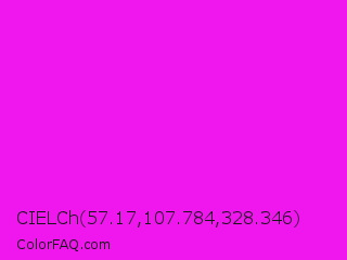 CIELCh 57.17,107.784,328.346 Color is a normal magenta color and the nearest color is Phlox #df00ff. Hex code #ef16ee and RGB value is rgb(239,22,238). In RGB color space, this color is composed of 94% red, 9% green, 93% blue, In CMYK color space, this color is composed of 0% cyan, 91% magenta, 0% yellow , 6% black , In HSL color space, this color has a hue angle of 300° , 87% saturation and 51% lightness.