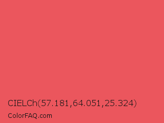 CIELCh 57.181,64.051,25.324 Color is a light red color and the nearest color is Mandy #e25465. Hex code #eb565d and RGB value is rgb(235,86,93). In RGB color space, this color is composed of 92% red, 34% green, 36% blue, In CMYK color space, this color is composed of 0% cyan, 63% magenta, 60% yellow , 8% black , In HSL color space, this color has a hue angle of 357° , 79% saturation and 63% lightness.