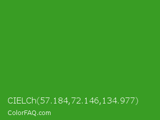 CIELCh 57.184,72.146,134.977 Color is a normal green color and the nearest color is Slimy Green #299617. Hex code #399d24 and RGB value is rgb(57,157,36). In RGB color space, this color is composed of 22% red, 62% green, 14% blue, In CMYK color space, this color is composed of 64% cyan, 0% magenta, 77% yellow , 38% black , In HSL color space, this color has a hue angle of 110° , 63% saturation and 38% lightness.