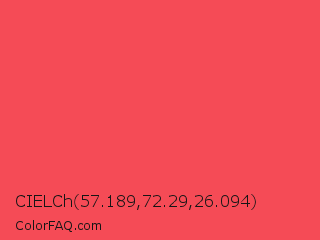 CIELCh 57.189,72.29,26.094 Color is a light red color and the nearest color is Tart Orange #fb4d46. Hex code #f54b56 and RGB value is rgb(245,75,86). In RGB color space, this color is composed of 96% red, 29% green, 34% blue, In CMYK color space, this color is composed of 0% cyan, 69% magenta, 65% yellow , 4% black , In HSL color space, this color has a hue angle of 356° , 89% saturation and 63% lightness.