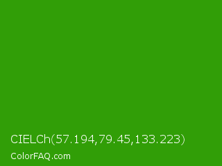 CIELCh 57.194,79.45,133.223 Color is a normal green color and the nearest color is Slimy Green #299617. Hex code #319e07 and RGB value is rgb(49,158,7). In RGB color space, this color is composed of 19% red, 62% green, 3% blue, In CMYK color space, this color is composed of 69% cyan, 0% magenta, 96% yellow , 38% black , In HSL color space, this color has a hue angle of 103° , 92% saturation and 32% lightness.