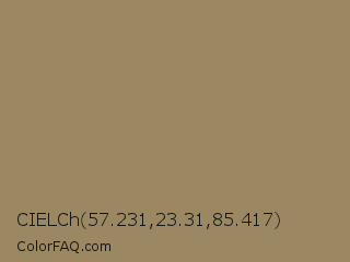 CIELCh 57.231,23.31,85.417 Color is a normal orange color and the nearest color is Barley Corn #a68b5b. Hex code #9b8761 and RGB value is rgb(155,135,97). In RGB color space, this color is composed of 61% red, 53% green, 38% blue, In CMYK color space, this color is composed of 0% cyan, 13% magenta, 37% yellow , 39% black , In HSL color space, this color has a hue angle of 39° , 23% saturation and 49% lightness.