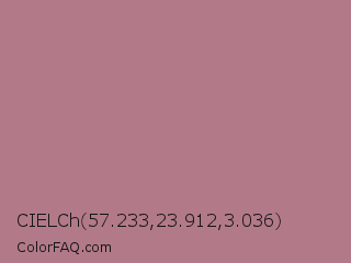 CIELCh 57.233,23.912,3.036 Color is a normal red color and the nearest color is Turkish Rose #b57281. Hex code #b27a88 and RGB value is rgb(178,122,136). In RGB color space, this color is composed of 70% red, 48% green, 53% blue, In CMYK color space, this color is composed of 0% cyan, 31% magenta, 24% yellow , 30% black , In HSL color space, this color has a hue angle of 345° , 27% saturation and 59% lightness.