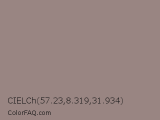 CIELCh 57.23,8.319,31.934 Color is a normal red color and the nearest color is Cinereous #98817b. Hex code #998582 and RGB value is rgb(153,133,130). In RGB color space, this color is composed of 60% red, 52% green, 51% blue, In CMYK color space, this color is composed of 0% cyan, 13% magenta, 15% yellow , 40% black , In HSL color space, this color has a hue angle of 8° , 10% saturation and 55% lightness.