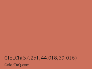 CIELCh 57.251,44.018,39.016 Color is a normal red color and the nearest color is Copper Red #cb6d51. Hex code #cc705b and RGB value is rgb(204,112,91). In RGB color space, this color is composed of 80% red, 44% green, 36% blue, In CMYK color space, this color is composed of 0% cyan, 45% magenta, 55% yellow , 20% black , In HSL color space, this color has a hue angle of 11° , 53% saturation and 58% lightness.