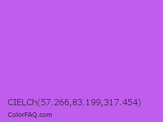 CIELCh 57.266,83.199,317.454 Color is a light purple color and the nearest color is Medium Orchid #ba55d3. Hex code #bf5eed and RGB value is rgb(191,94,237). In RGB color space, this color is composed of 75% red, 37% green, 93% blue, In CMYK color space, this color is composed of 19% cyan, 60% magenta, 0% yellow , 7% black , In HSL color space, this color has a hue angle of 281° , 80% saturation and 65% lightness.