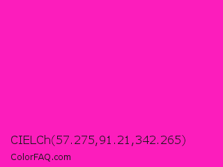 CIELCh 57.275,91.21,342.265 Color is a normal magenta color and the nearest color is Shocking Pink #fc0fc0. Hex code #fc1dbc and RGB value is rgb(252,29,188). In RGB color space, this color is composed of 99% red, 11% green, 74% blue, In CMYK color space, this color is composed of 0% cyan, 88% magenta, 25% yellow , 1% black , In HSL color space, this color has a hue angle of 317° , 97% saturation and 55% lightness.
