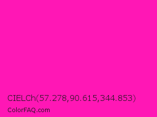CIELCh 57.278,90.615,344.853 Color is a normal magenta color and the nearest color is Shocking Pink #fc0fc0. Hex code #ff17b5 and RGB value is rgb(255,23,181). In RGB color space, this color is composed of 100% red, 9% green, 71% blue, In CMYK color space, this color is composed of 0% cyan, 91% magenta, 29% yellow , 0% black , In HSL color space, this color has a hue angle of 319° , 100% saturation and 55% lightness.