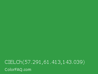 CIELCh 57.291,61.413,143.039 Color is a normal green color and the nearest color is Sea Green #2e8b57. Hex code #329d45 and RGB value is rgb(50,157,69). In RGB color space, this color is composed of 20% red, 62% green, 27% blue, In CMYK color space, this color is composed of 68% cyan, 0% magenta, 56% yellow , 38% black , In HSL color space, this color has a hue angle of 131° , 52% saturation and 41% lightness.