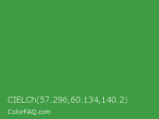 CIELCh 57.296,60.134,140.2 Color is a normal green color and the nearest color is May Green #4c9141. Hex code #3f9c42 and RGB value is rgb(63,156,66). In RGB color space, this color is composed of 25% red, 61% green, 26% blue, In CMYK color space, this color is composed of 60% cyan, 0% magenta, 58% yellow , 39% black , In HSL color space, this color has a hue angle of 122° , 42% saturation and 43% lightness.