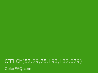 CIELCh 57.29,75.193,132.079 Color is a normal green color and the nearest color is Slimy Green #299617. Hex code #3f9d14 and RGB value is rgb(63,157,20). In RGB color space, this color is composed of 25% red, 62% green, 8% blue, In CMYK color space, this color is composed of 60% cyan, 0% magenta, 87% yellow , 38% black , In HSL color space, this color has a hue angle of 101° , 77% saturation and 35% lightness.