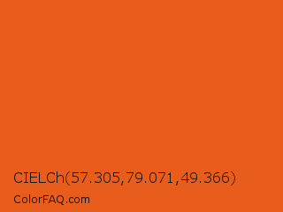 CIELCh 57.305,79.071,49.366 Color is a normal orange color and the nearest color is Vivid Vermilion #e56024. Hex code #e95d1c and RGB value is rgb(233,93,28). In RGB color space, this color is composed of 91% red, 36% green, 11% blue, In CMYK color space, this color is composed of 0% cyan, 60% magenta, 88% yellow , 9% black , In HSL color space, this color has a hue angle of 19° , 82% saturation and 51% lightness.