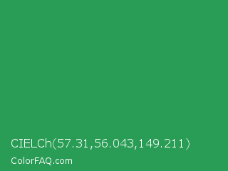 CIELCh 57.31,56.043,149.211 Color is a normal green color and the nearest color is Sea Green #2e8b57. Hex code #299d55 and RGB value is rgb(41,157,85). In RGB color space, this color is composed of 16% red, 62% green, 33% blue, In CMYK color space, this color is composed of 74% cyan, 0% magenta, 46% yellow , 38% black , In HSL color space, this color has a hue angle of 143° , 59% saturation and 39% lightness.