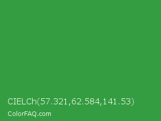 CIELCh 57.321,62.584,141.53 Color is a normal green color and the nearest color is Wageningen Green #34b233. Hex code #359d41 and RGB value is rgb(53,157,65). In RGB color space, this color is composed of 21% red, 62% green, 25% blue, In CMYK color space, this color is composed of 66% cyan, 0% magenta, 59% yellow , 38% black , In HSL color space, this color has a hue angle of 127° , 50% saturation and 41% lightness.