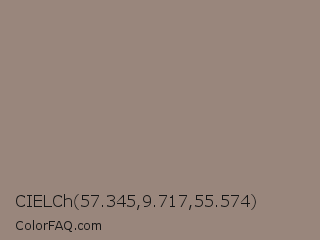 CIELCh 57.345,9.717,55.574 Color is a normal orange color and the nearest color is Cinereous #98817b. Hex code #99867c and RGB value is rgb(153,134,124). In RGB color space, this color is composed of 60% red, 53% green, 49% blue, In CMYK color space, this color is composed of 0% cyan, 12% magenta, 19% yellow , 40% black , In HSL color space, this color has a hue angle of 21° , 12% saturation and 54% lightness.