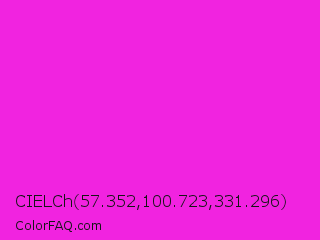 CIELCh 57.352,100.723,331.296 Color is a normal magenta color and the nearest color is Hot Magenta #ff1dce. Hex code #f123e0 and RGB value is rgb(241,35,224). In RGB color space, this color is composed of 95% red, 14% green, 88% blue, In CMYK color space, this color is composed of 0% cyan, 85% magenta, 7% yellow , 5% black , In HSL color space, this color has a hue angle of 305° , 88% saturation and 54% lightness.