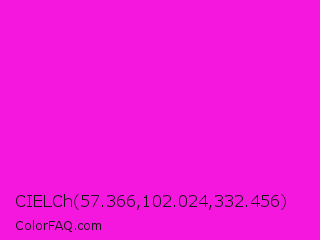 CIELCh 57.366,102.024,332.456 Color is a normal magenta color and the nearest color is Hot Magenta #ff1dce. Hex code #f517de and RGB value is rgb(245,23,222). In RGB color space, this color is composed of 96% red, 9% green, 87% blue, In CMYK color space, this color is composed of 0% cyan, 91% magenta, 9% yellow , 4% black , In HSL color space, this color has a hue angle of 306° , 92% saturation and 53% lightness.