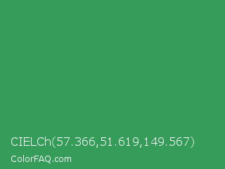 CIELCh 57.366,51.619,149.567 Color is a normal green color and the nearest color is Chateau Green #40a860. Hex code #369c5a and RGB value is rgb(54,156,90). In RGB color space, this color is composed of 21% red, 61% green, 35% blue, In CMYK color space, this color is composed of 65% cyan, 0% magenta, 42% yellow , 39% black , In HSL color space, this color has a hue angle of 141° , 49% saturation and 41% lightness.