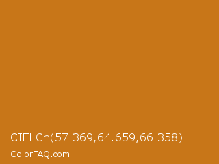 CIELCh 57.369,64.659,66.358 Color is a normal orange color and the nearest color is Ochre #cc7722. Hex code #c87618 and RGB value is rgb(200,118,24). In RGB color space, this color is composed of 78% red, 46% green, 9% blue, In CMYK color space, this color is composed of 0% cyan, 41% magenta, 88% yellow , 22% black , In HSL color space, this color has a hue angle of 32° , 79% saturation and 44% lightness.