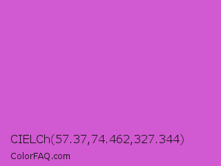 CIELCh 57.37,74.462,327.344 Color is a normal magenta color and the nearest color is Fuchsia Pink #c154c1. Hex code #d159d1 and RGB value is rgb(209,89,209). In RGB color space, this color is composed of 82% red, 35% green, 82% blue, In CMYK color space, this color is composed of 0% cyan, 57% magenta, 0% yellow , 18% black , In HSL color space, this color has a hue angle of 300° , 57% saturation and 58% lightness.