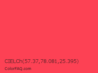 CIELCh 57.37,78.081,25.395 Color is a light red color and the nearest color is Sunburnt Cyclops #ff404c. Hex code #fd4154 and RGB value is rgb(253,65,84). In RGB color space, this color is composed of 99% red, 25% green, 33% blue, In CMYK color space, this color is composed of 0% cyan, 74% magenta, 67% yellow , 1% black , In HSL color space, this color has a hue angle of 354° , 98% saturation and 62% lightness.