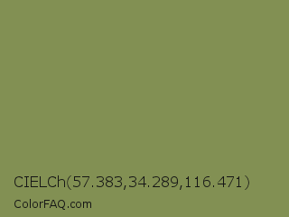 CIELCh 57.383,34.289,116.471 Color is a normal lime color and the nearest color is Moss Green #8a9a5b. Hex code #829053 and RGB value is rgb(130,144,83). In RGB color space, this color is composed of 51% red, 56% green, 33% blue, In CMYK color space, this color is composed of 10% cyan, 0% magenta, 42% yellow , 44% black , In HSL color space, this color has a hue angle of 74° , 27% saturation and 45% lightness.