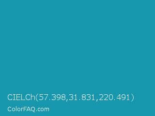 CIELCh 57.398,31.831,220.491 Color is a normal cyan color and the nearest color is Eastern Blue #1e9ab0. Hex code #1797ad and RGB value is rgb(23,151,173). In RGB color space, this color is composed of 9% red, 59% green, 68% blue, In CMYK color space, this color is composed of 87% cyan, 13% magenta, 0% yellow , 32% black , In HSL color space, this color has a hue angle of 189° , 77% saturation and 38% lightness.