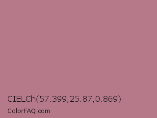 CIELCh 57.399,25.87,0.869 Color is a normal rose color and the nearest color is Turkish Rose #b57281. Hex code #b5798a and RGB value is rgb(181,121,138). In RGB color space, this color is composed of 71% red, 47% green, 54% blue, In CMYK color space, this color is composed of 0% cyan, 33% magenta, 24% yellow , 29% black , In HSL color space, this color has a hue angle of 343° , 29% saturation and 59% lightness.