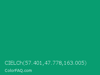 CIELCh 57.401,47.778,163.005 Color is a normal green color and the nearest color is Green NCS #009f6b. Hex code #089d70 and RGB value is rgb(8,157,112). In RGB color space, this color is composed of 3% red, 62% green, 44% blue, In CMYK color space, this color is composed of 95% cyan, 0% magenta, 29% yellow , 38% black , In HSL color space, this color has a hue angle of 162° , 90% saturation and 32% lightness.