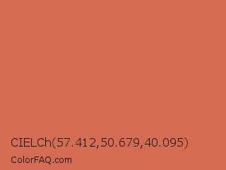 CIELCh 57.412,50.679,40.095 Color is a normal red color and the nearest color is Copper Red #cb6d51. Hex code #d46c53 and RGB value is rgb(212,108,83). In RGB color space, this color is composed of 83% red, 42% green, 33% blue, In CMYK color space, this color is composed of 0% cyan, 49% magenta, 61% yellow , 17% black , In HSL color space, this color has a hue angle of 12° , 60% saturation and 58% lightness.