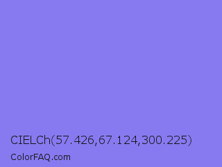 CIELCh 57.426,67.124,300.225 Color is a light indigo color and the nearest color is Medium Slate Blue #7b68ee. Hex code #877af0 and RGB value is rgb(135,122,240). In RGB color space, this color is composed of 53% red, 48% green, 94% blue, In CMYK color space, this color is composed of 44% cyan, 49% magenta, 0% yellow , 6% black , In HSL color space, this color has a hue angle of 247° , 80% saturation and 71% lightness.