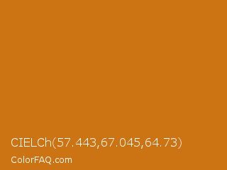 CIELCh 57.443,67.045,64.73 Color is a normal orange color and the nearest color is Meteor #d07d12. Hex code #cc7414 and RGB value is rgb(204,116,20). In RGB color space, this color is composed of 80% red, 45% green, 8% blue, In CMYK color space, this color is composed of 0% cyan, 43% magenta, 90% yellow , 20% black , In HSL color space, this color has a hue angle of 31° , 82% saturation and 44% lightness.