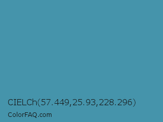 CIELCh 57.449,25.93,228.296 Color is a normal blue color and the nearest color is Boston Blue #3b91b4. Hex code #4594ab and RGB value is rgb(69,148,171). In RGB color space, this color is composed of 27% red, 58% green, 67% blue, In CMYK color space, this color is composed of 60% cyan, 13% magenta, 0% yellow , 33% black , In HSL color space, this color has a hue angle of 194° , 43% saturation and 47% lightness.