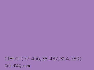 CIELCh 57.456,38.437,314.589 Color is a light purple color and the nearest color is Lavender Purple #967bb6. Hex code #a27bba and RGB value is rgb(162,123,186). In RGB color space, this color is composed of 64% red, 48% green, 73% blue, In CMYK color space, this color is composed of 13% cyan, 34% magenta, 0% yellow , 27% black , In HSL color space, this color has a hue angle of 277° , 31% saturation and 61% lightness.
