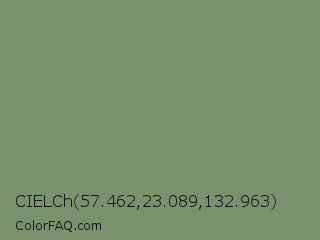 CIELCh 57.462,23.089,132.963 Color is a normal green color and the nearest color is Battleship Gray #828f72. Hex code #79916c and RGB value is rgb(121,145,108). In RGB color space, this color is composed of 47% red, 57% green, 42% blue, In CMYK color space, this color is composed of 17% cyan, 0% magenta, 26% yellow , 43% black , In HSL color space, this color has a hue angle of 99° , 15% saturation and 50% lightness.