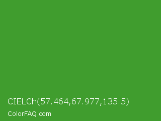 CIELCh 57.464,67.977,135.5 Color is a normal green color and the nearest color is Apple #4fa83d. Hex code #409d2e and RGB value is rgb(64,157,46). In RGB color space, this color is composed of 25% red, 62% green, 18% blue, In CMYK color space, this color is composed of 59% cyan, 0% magenta, 71% yellow , 38% black , In HSL color space, this color has a hue angle of 110° , 55% saturation and 40% lightness.
