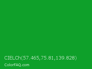 CIELCh 57.465,75.81,139.828 Color is a normal green color and the nearest color is North Texas Green #059033. Hex code #0ea02a and RGB value is rgb(14,160,42). In RGB color space, this color is composed of 5% red, 63% green, 16% blue, In CMYK color space, this color is composed of 91% cyan, 0% magenta, 74% yellow , 37% black , In HSL color space, this color has a hue angle of 132° , 84% saturation and 34% lightness.