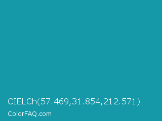 CIELCh 57.469,31.854,212.571 Color is a normal cyan color and the nearest color is Eastern Blue #1e9ab0. Hex code #1598a7 and RGB value is rgb(21,152,167). In RGB color space, this color is composed of 8% red, 60% green, 65% blue, In CMYK color space, this color is composed of 87% cyan, 9% magenta, 0% yellow , 35% black , In HSL color space, this color has a hue angle of 186° , 78% saturation and 37% lightness.