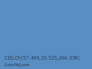 CIELCh 57.469,33.525,266.338 Color is a normal blue color and the nearest color is Silver Lake Blue #5d89ba. Hex code #588ec4 and RGB value is rgb(88,142,196). In RGB color space, this color is composed of 35% red, 56% green, 77% blue, In CMYK color space, this color is composed of 55% cyan, 28% magenta, 0% yellow , 23% black , In HSL color space, this color has a hue angle of 210° , 48% saturation and 56% lightness.